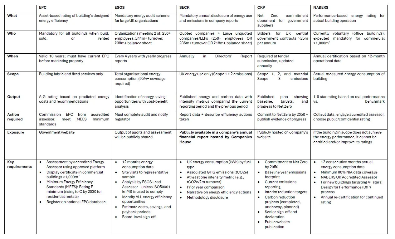 There are multiple frameworks for assessing and reporting on energy efficiency - EPC, ESOS, SECR, CRP and NABERS are considered here ;