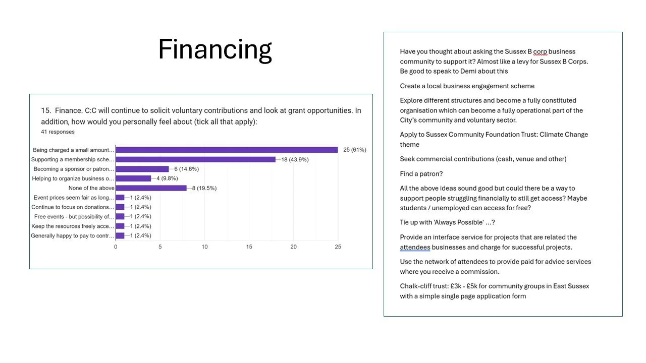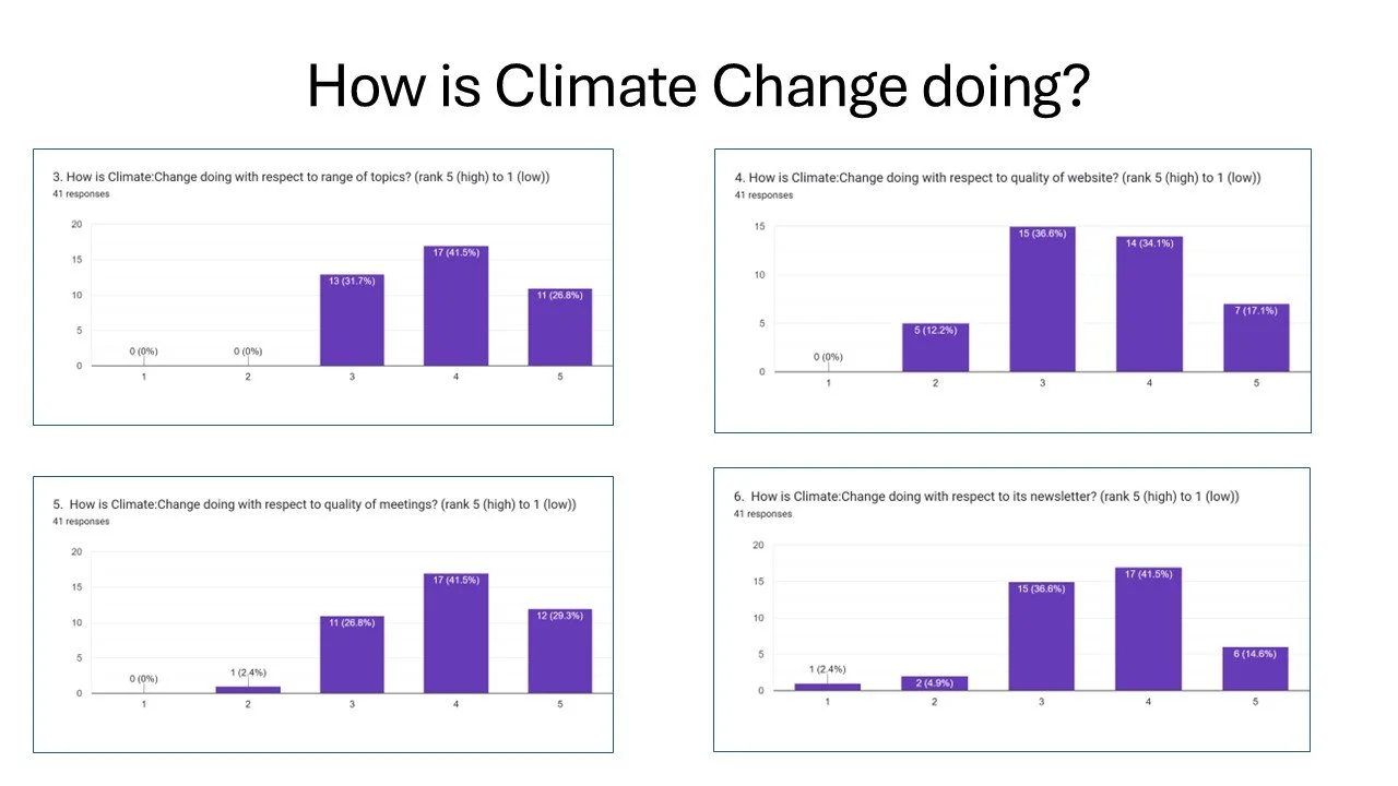 Most respondents were employed or self-employed, with a significant number of retired people, and just a few students. Engagement was mainly via attending Climate:Change meetings or reading posts on the website.