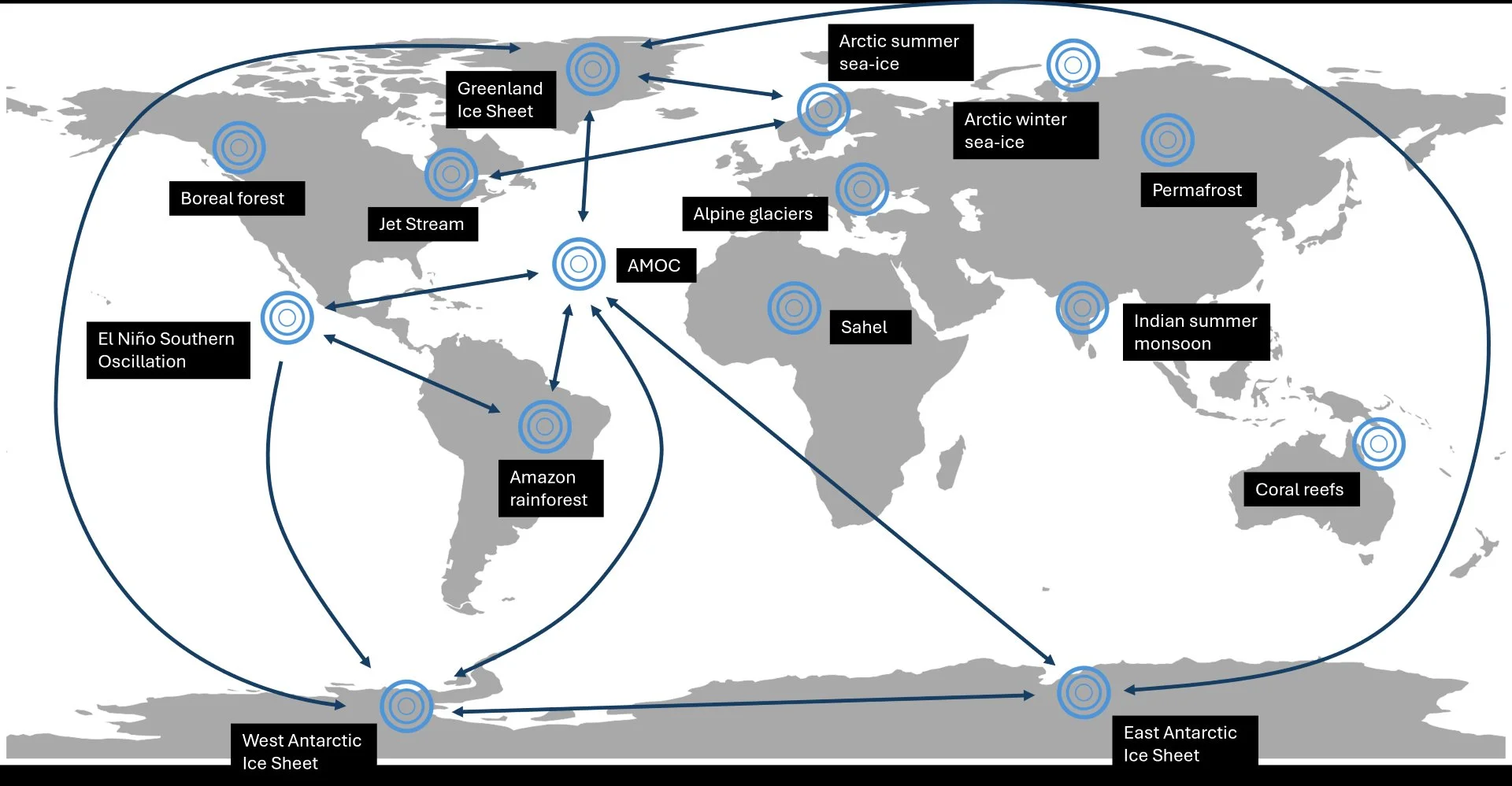 Map of some of the known climate tipping points. Arrows show the interactions between tipping points and the potential of cascades.