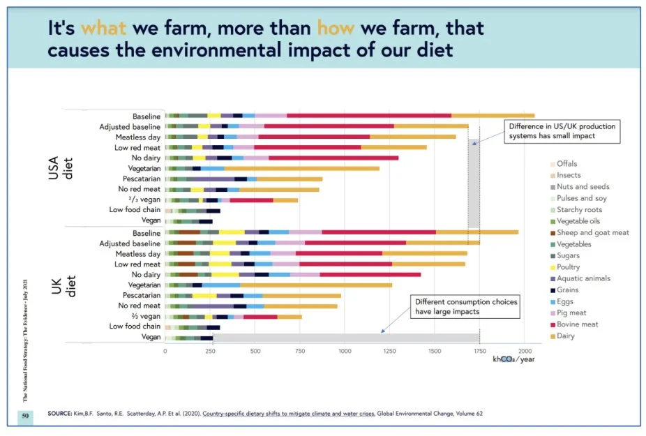 The Food Strategy also explored the impact on GHG emissions of different diets: reducing meat and dairy have a big impact on emissions (Figure 6). The food supply chain is complex and nuanced as it moves along each stage but the stand-out issue is that in beef and lamb production, emissions from animal feed production, land conversion, and methane production are very significant.